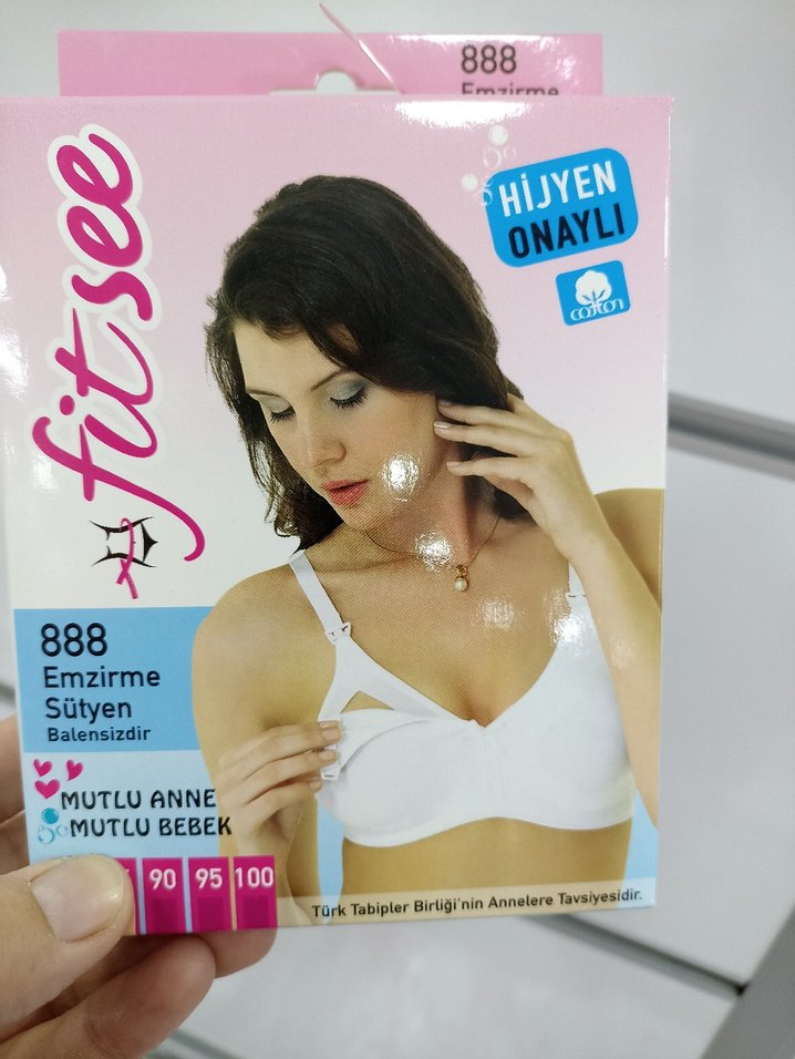 Baskılı, beyaz, balensiz, emzirme sütyeni. Fitted kesim, midi boy ve hijyen onaylıdır. Rahat kullanım sağlar.