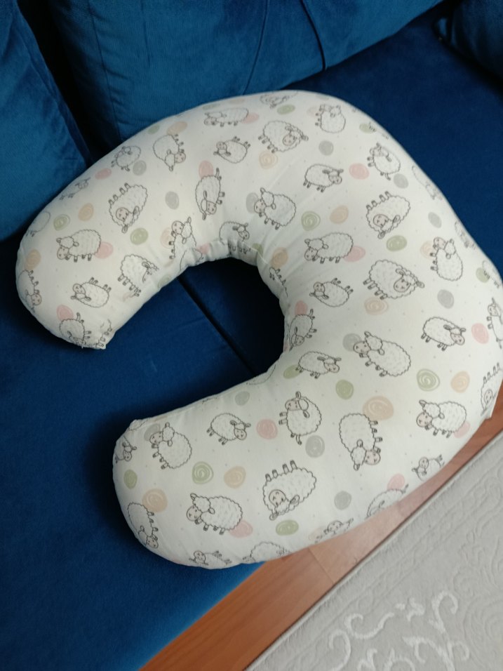 Beyaz zemin üzerine pastel tonlarda baskılı, yumuşak kumaşlı hamile ve emzirme yastığı. Rahatlık ve destek sağlar.