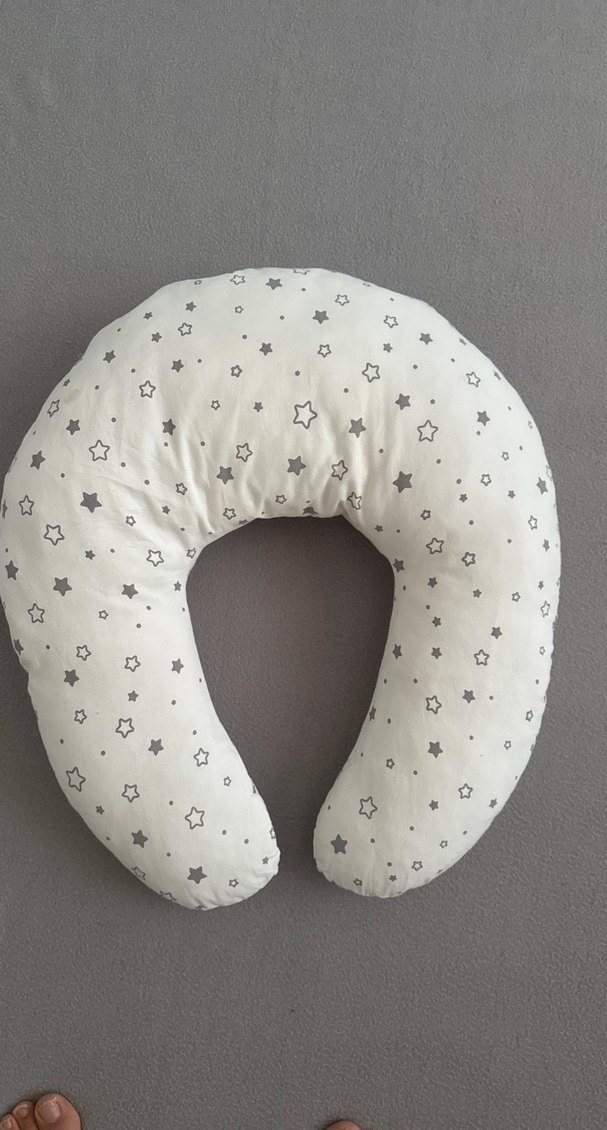 Gri yıldız baskılı beyaz emzirme ve hamilelik yastığı, rahat destek sağlar.