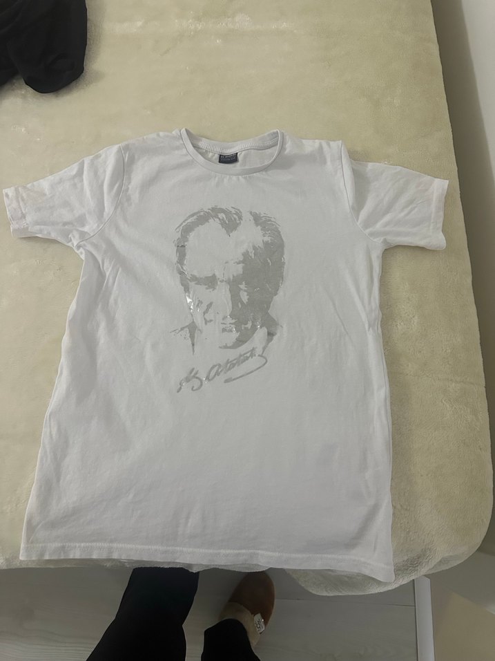 Atatürk tişörtü Pamuklu kumaştan, kısa kollu, bol kesim beyaz erkek çocuk tişörtü. Önünde gri baskılı portre detayı bulunur.