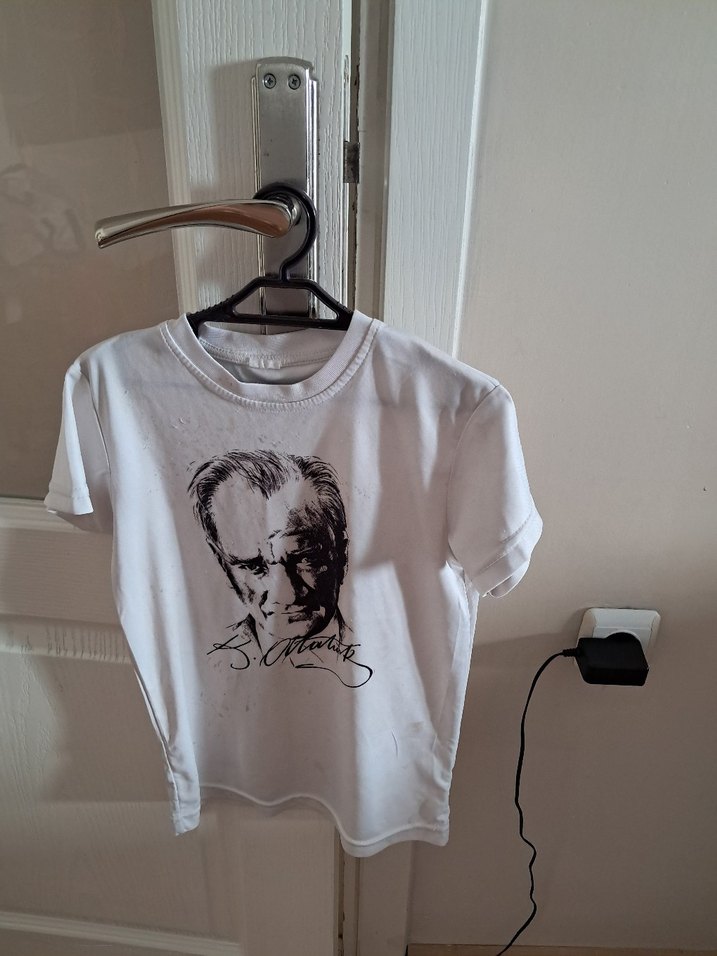 Beyaz çocuk atleti, önünde gri baskılı portre ve imza deseni bulunur. Yumuşak kumaştan üretilmiştir. önünde lekeler var ,köyde falan giyilebilir
