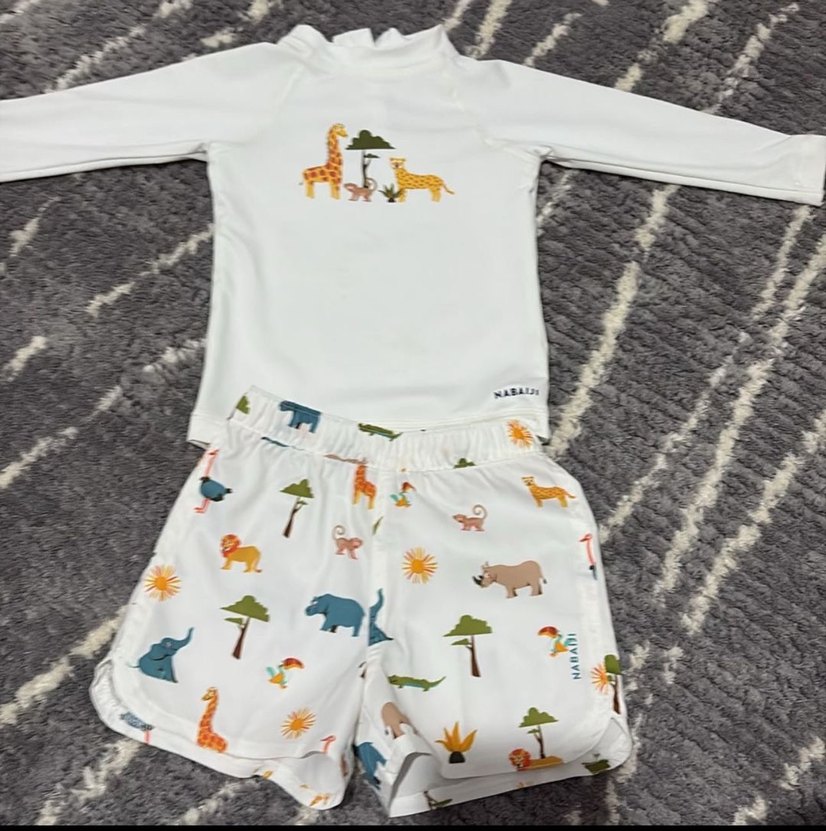 Beyaz kısa kollu üstü hayvan baskılı, renkli hayvan ve doğa desenli şortlu erkek çocuk mayo takımı.