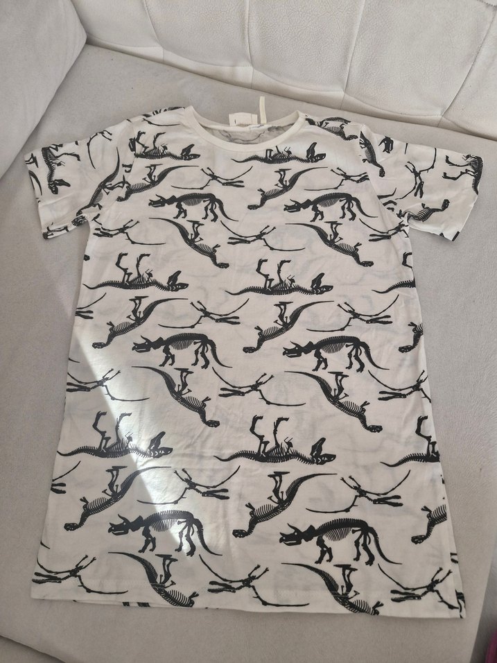 Geniş kesim, kısa kollu, yuvarlak yaka beyaz erkek çocuk tişörtü, siyah baskılı desenli. Düzgün sentetik kumaştan, sokak stili için uygun.