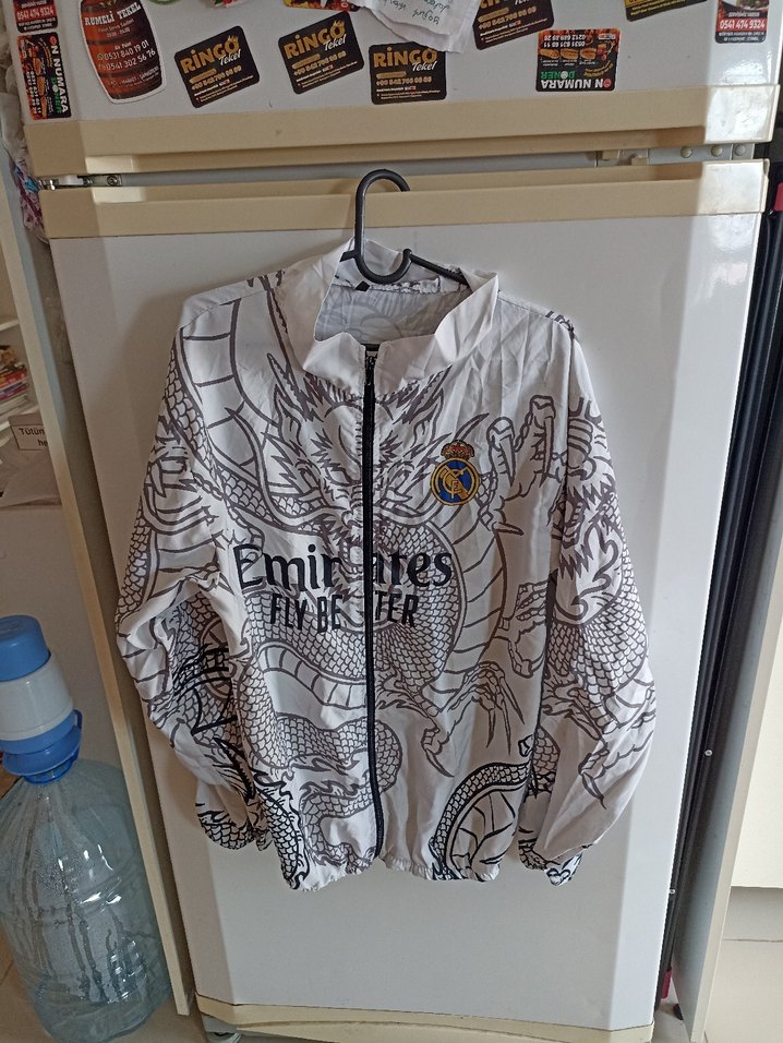 M beden. Az kullanildi. Ince. Beyaz renkli, baskılı ejderha desenli, uzun kollu ve fermuarlı erkek ceket. Rahat kesimi ile dış mekan kullanımı için uygundur.