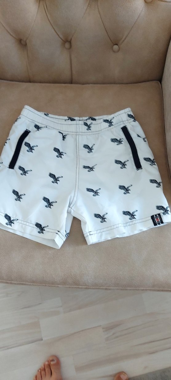 Baskılı kartal desenli, beyaz ve fitted kesim erkek mayo. Plajda rahat ve şık bir görünüm sağlar. 6 beden , bel 29 , boy 30 cm .