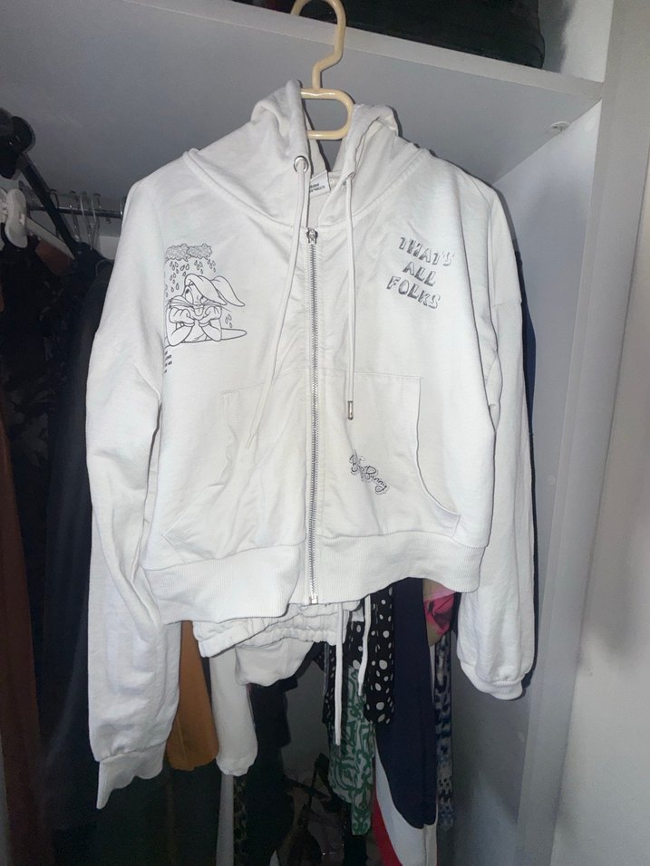Beyaz kadın eşofman takımı, yüksek yaka, uzun kollu ve bol kesimdir. Fermuarlı ön kısmı ve baskılı desenleri vardır, yumuşak ve sıcak kumaştan üretilmiştir.