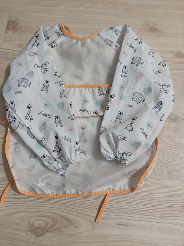 Uzun kollu, baskılı gri ve beyaz renklerde bebek önlüğü. Lastikli manşetleri ve bağlama ipleri bulunur. ikili