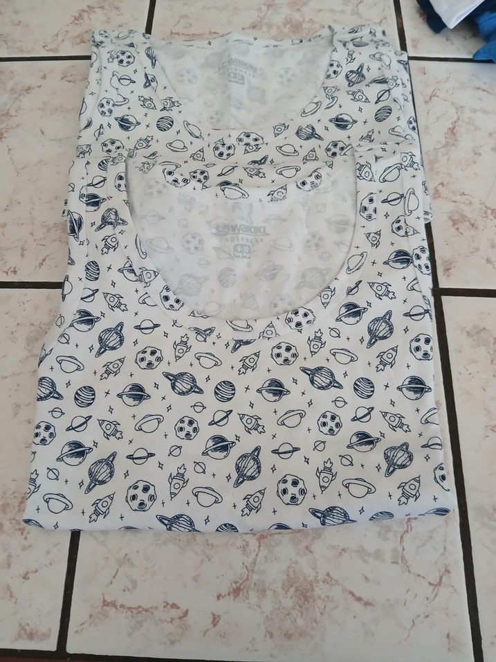 Yuvarlak yakalı, beyaz zemin üzerine gri uzay temalı baskılar bulunan çocuk atleti. Yumuşak ve rahat kumaştan üretilmiştir. Yakada 'A' harfi baskılıdır. 9 10 yaş