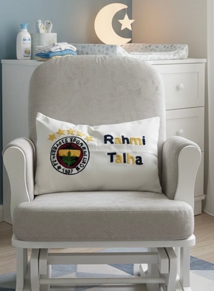 Rahmi ve Talha isimleri ile baskılı, beyaz ve gri renkli yastık. Evde kullanıma uygun yumuşak kumaş. ️