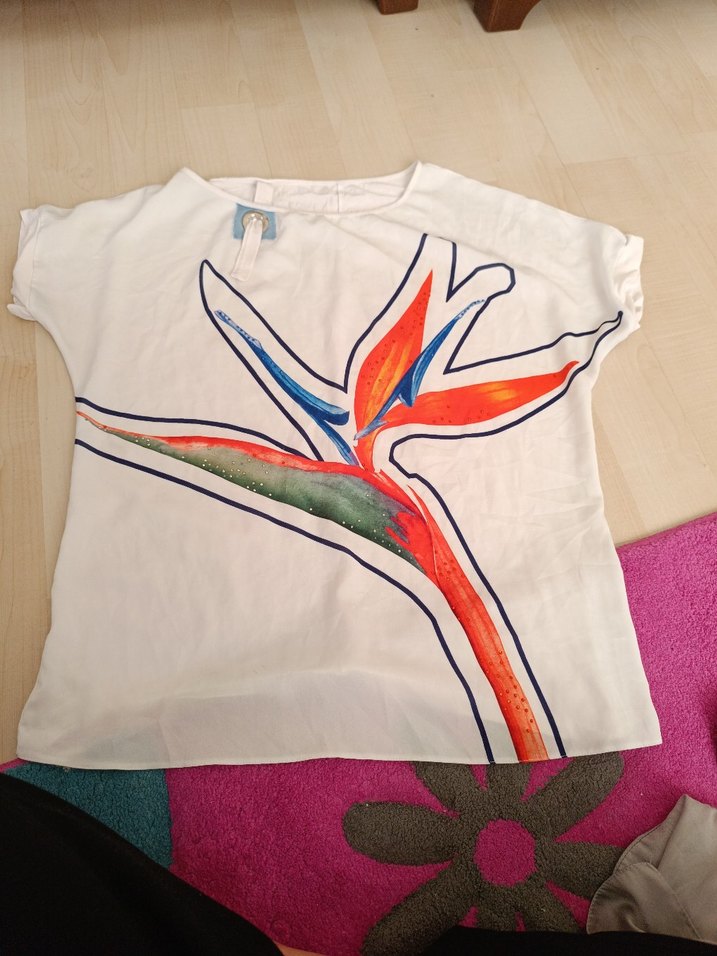 Rahat kesim, kısa kollu, beyaz hamile tişörtü. Canlı renklerde tropikal çiçek baskısı ve yuvarlak yaka. Günlük kullanım için uygun, bohem tarzda.