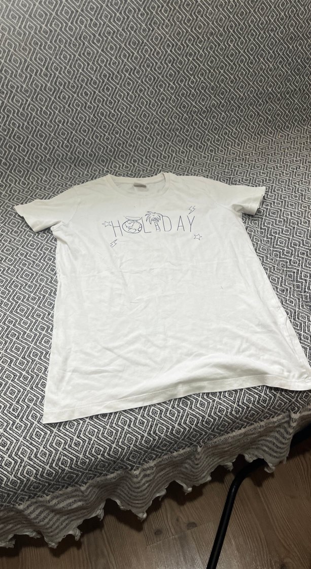 Beyaz pamuklu hamile tişörtü, kısa kollu ve bol kesim. Üzerinde 'HETDAY' baskısı bulunur, günlük rahat stil sunar.