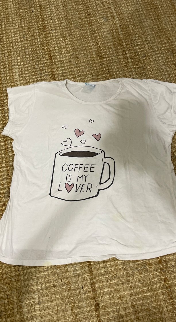 Pamuklu, kısa kollu, yuvarlak yakalı, bol kesim beyaz hamile tişörtü. Üzerinde kalp desenli kahve kupası baskısı bulunur. ☕