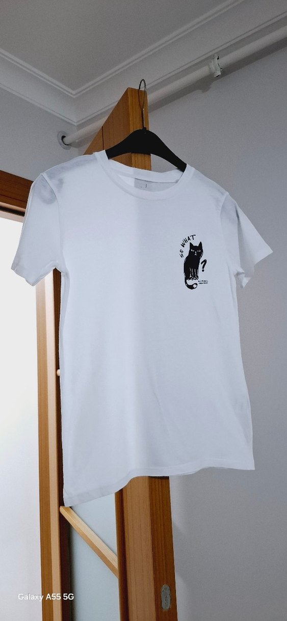 Beyaz hamile tişörtü, yuvarlak yaka ve kısa kolludur. Pamuklu kumaştan, bol kesim ve üzerinde 'WHAT?' yazılı siyah kedi baskısı vardır. Rahat ve şık, günlük kullanım için uygundur.