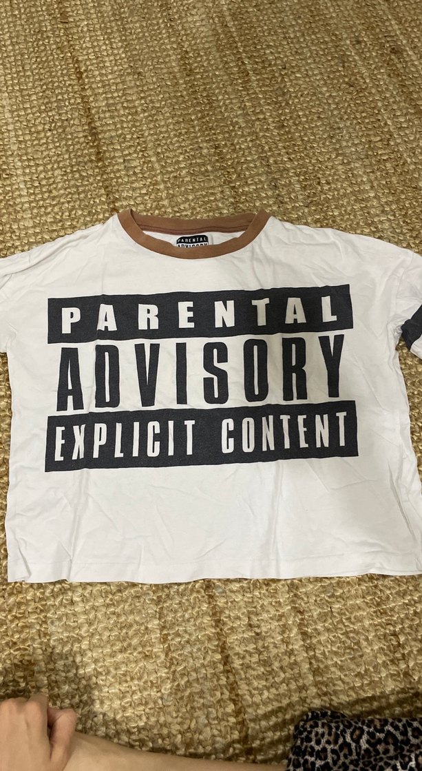 Beyaz pamuk hamile tişörtü, kısa kollu ve rahat kesimdir. 'Parental Advisory Explicit Content' baskılı, yuvarlak yaka ve günlük kullanıma uygun.