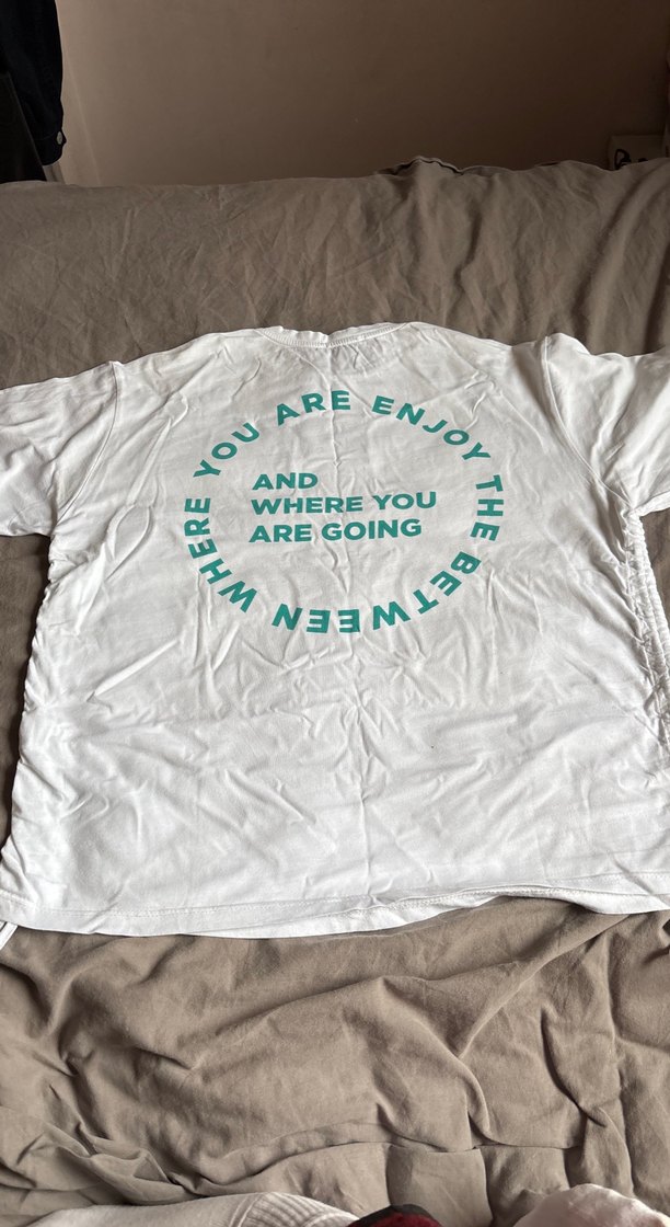 Beyaz pamuklu hamile tişörtü, kısa kollu ve rahat kesimdir. Sırtında yazılı baskılı dairesel desen bulunur. Günlük kullanım için uygundur.