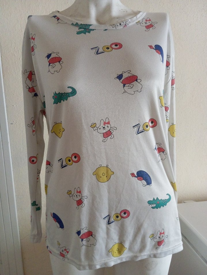 Beyaz, uzun kollu, bisiklet yaka hamile tişörtü pamuklu, rahat kesimdir. Sevimli hayvan desenleriyle baskılı ve örme dokudadır, günlük kullanıma uygundur.