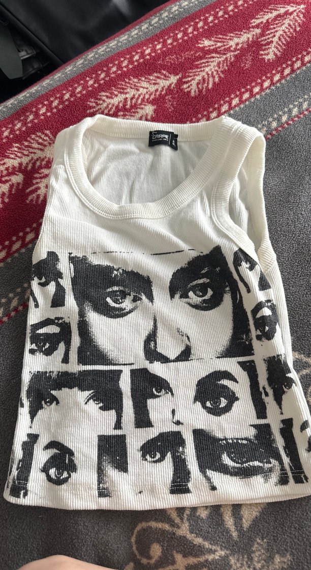Beyaz renkli, yüksek yakalı ve baskılı yüz deseni bulunan, dar kesim kadın günlük kullanıma uygun.