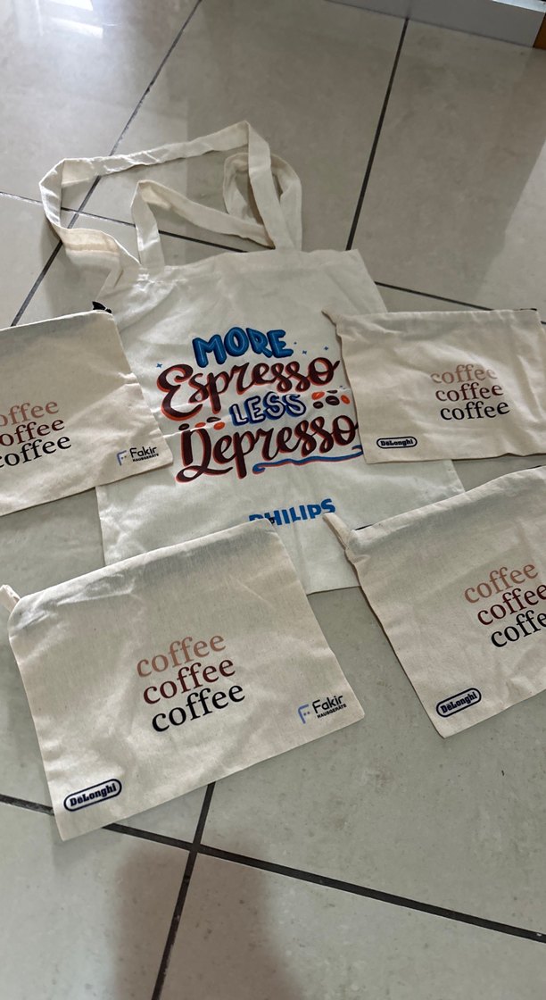 Pamuklu beyaz kumaş üzerine baskılı kahve temalı desenli kadın bez çanta. Günlük kullanıma uygun, sade ve rahat tarzda. ☕