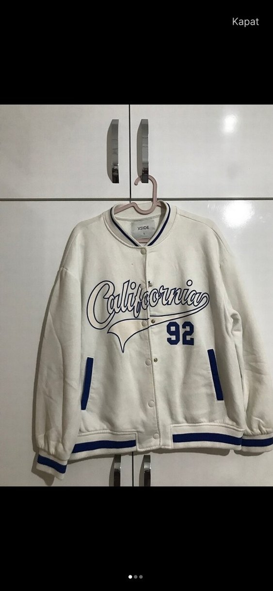Pamuklu beyaz ceket uzun kollu, yuvarlak yaka ve rahat kesime sahiptir. Üzerinde California baskısı ve 92 sayısı bulunur, düğmeli ve mavi ceplidir. Günlük sokak stili için uygundur.