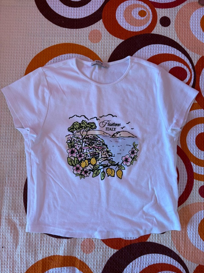 Pamuklu, bol kesim beyaz tişört, kısa kollu ve yuvarlak yakalıdır. Çiçek ve sahil temalı renkli baskısıyla rahat bir sokak stili sunar.