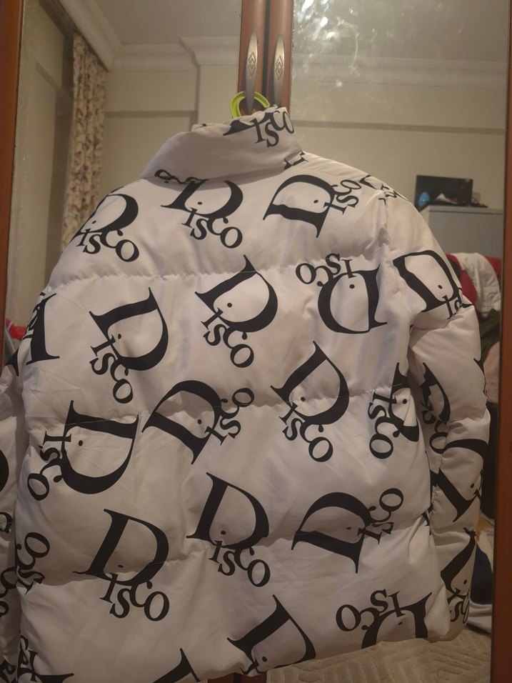 Baskılı, düğmeli, uzun kollu, bol kesim beyaz kadın kışlık mont. Yuvarlak yaka ve midi boy, sokak stili için uygun. ❄️