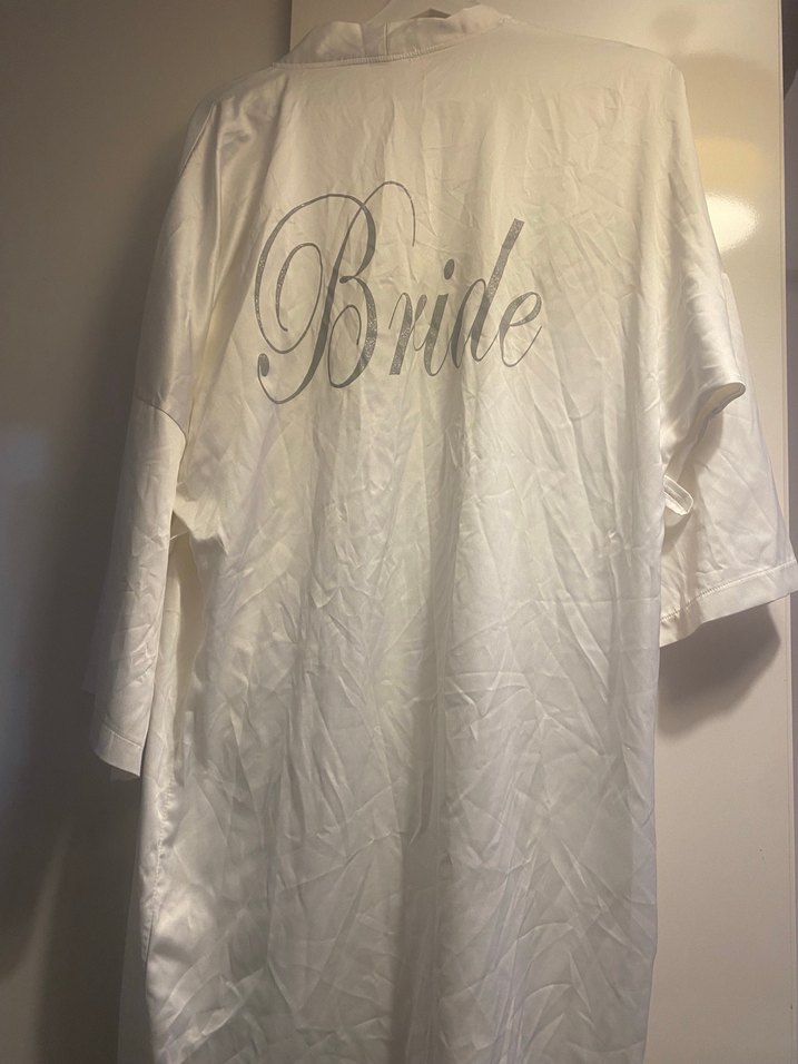 Beyaz renkli, kısa kollu, bol kesim midi boy kadın robe. Kumaşı parlak ve sırtında "Bride" baskısı bulunur. Sbeden l bedene kadar olur