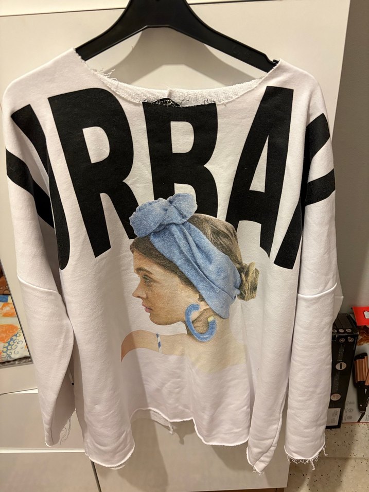 Beyaz, bol kesim, yuvarlak yaka ve uzun kollu kadın sweatshirtü. Baskılı deseni ve rahat street style görünümü ile keten kumaştan üretilmiştir.