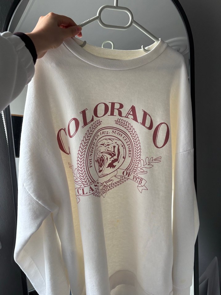Pamuklu, uzun kollu, bisiklet yakalı beyaz sweatshirt. Bol kesim ve baskılı Colorado deseni ile rahat günlük stil için uygundur.