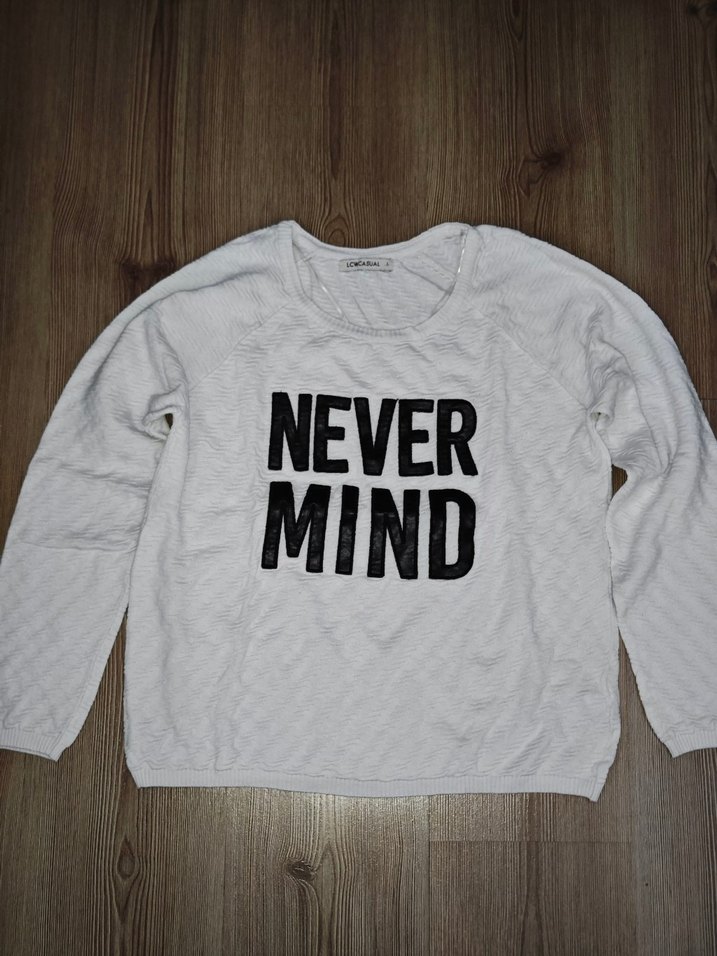 Bu kadın sweatshirtü uzun kollu, bisiklet yaka ve bol kesime sahiptir. Yumuşak pamuktan örülmüş, önünde "NEVER MIND" baskısı bulunur. Beyaz renkte ve günlük kullanıma uygundur. M/L uyumludur