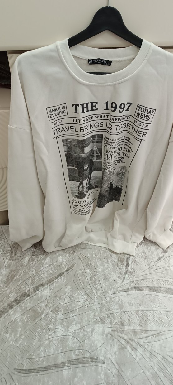 Pamuklu, baskılı gazete desenli beyaz sweatshirt, uzun kollu ve rahat kesim. Sokak modasına uygun, günlük kullanıma uygun rahat bir parça.
