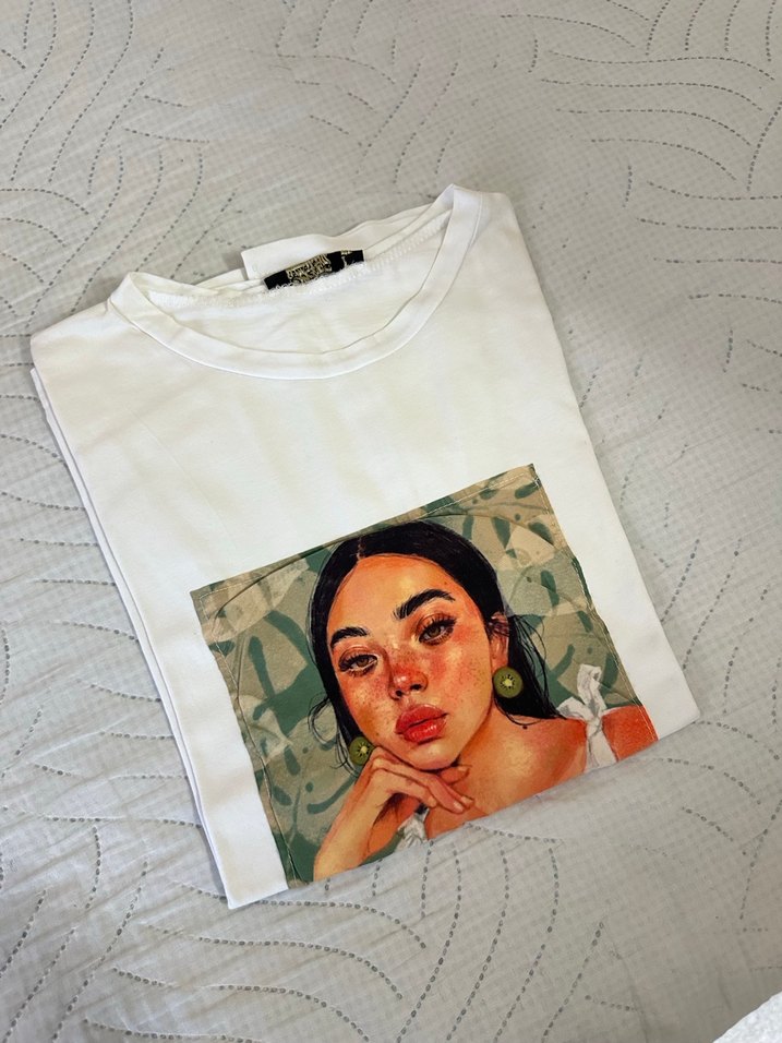 Beyaz pamuklu tişört, yuvarlak yaka ve kısa kolludur. Ön kısmında baskılı grafik bulunur, rahat ve salaş kesimlidir.