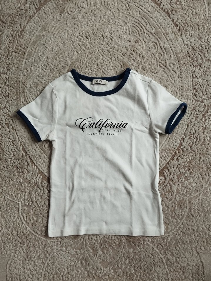 Pamuk kumaştan yapılmış, kısa kollu ve bisiklet yaka olan bu beyaz kadın tişörtü, gri "California" baskısıyla trend sokak modası stilini yansıtıyor.