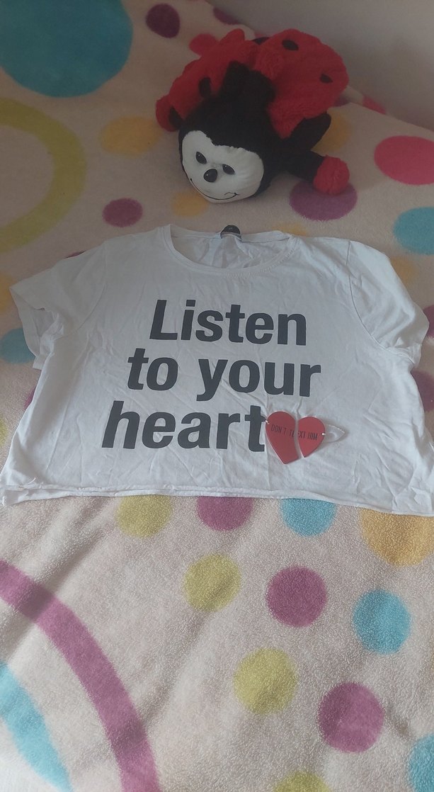 Pamuklu, kısa kollu, bol kesim beyaz kadın tişört, önünde "Listen to your heart" yazılı baskı vardır. Rahat ve günlük sokak stili için uygundur.