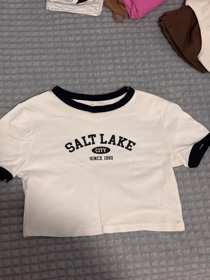 Pamuklu kumaştan, kısa kollu ve bisiklet yaka beyaz tişört. Üzerinde 'Salt Lake City Since 1990' baskısı ve koyu renk kol ve yaka detayları bulunur. Rahat kesim, günlük kullanım için uygun.