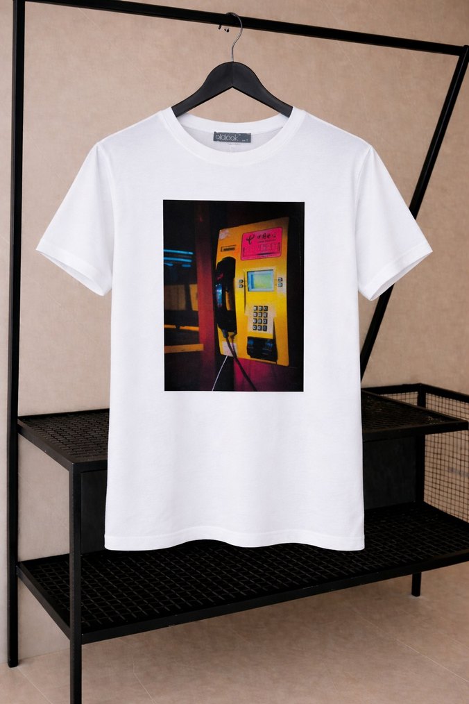 Pamuk kumaştan, kısa kollu ve yuvarlak yakalı, bol kesim beyaz kadın tişörtü. Önünde sarı telefon baskısı bulunur, sokak stiline uygun.