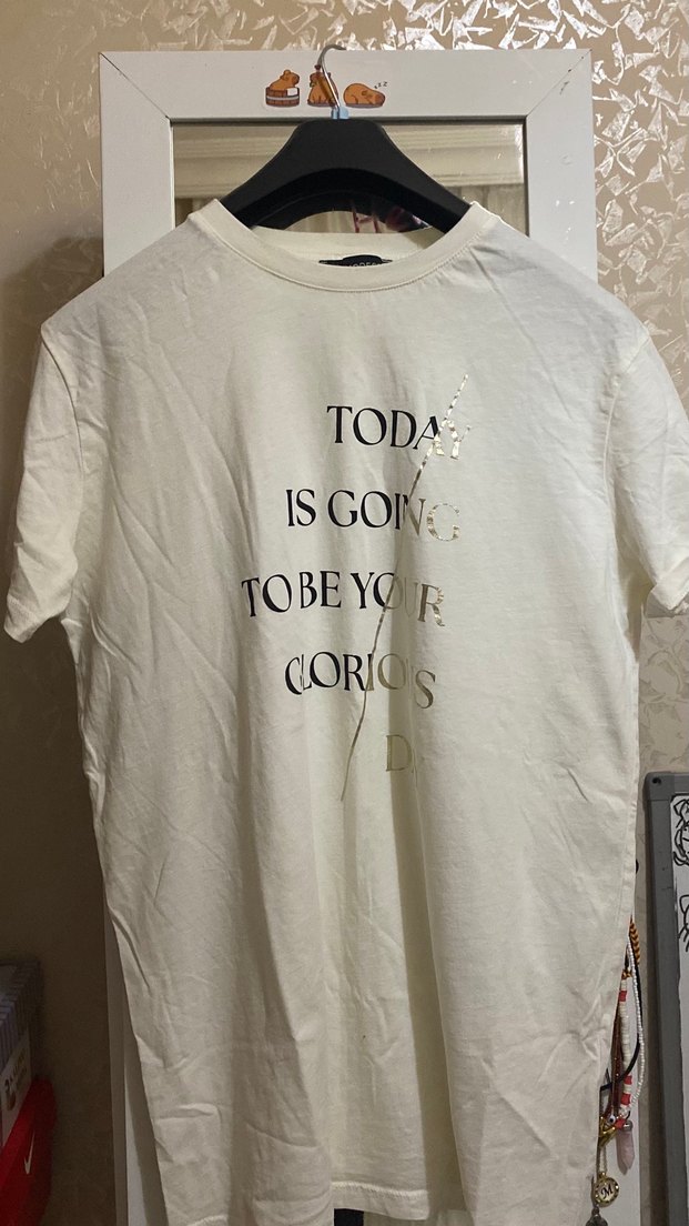 Pamuklu, kısa kollu, beyaz tişört. Salaş kesim ve yuvarlak yaka. Pastel tonlarda baskılı, günlük şık tarz için uygun. Hiç kullanılmadı