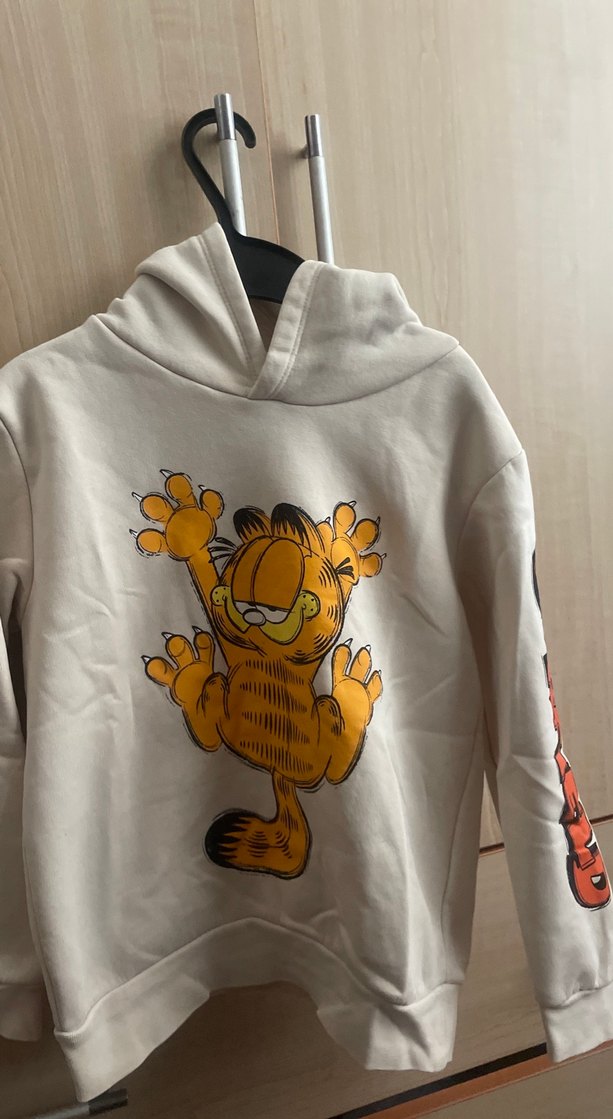 Beyaz renkte, önünde Garfield baskısı ve kollarda ekstra baskı detayları olan puff detaylı sweatshirt.