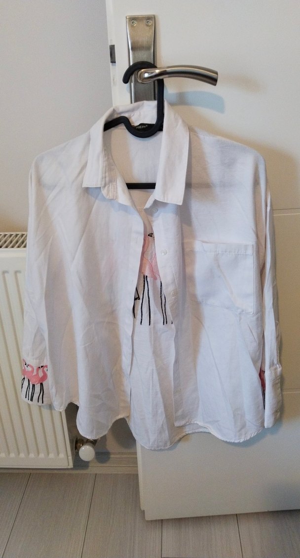 Düğmeli, yakalı, uzun kollu, bol kesim beyaz keten gömlek. Pastel baskılı detaylarla bohem tarzı sunar. Günlük kullanıma uygundur.