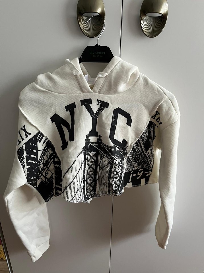 Baskılı NYC deseniyle beyaz, kısa kesim, uzun kollu, yuvarlak yaka, sentetik dokulu ve örme yapıda, günlük kullanıma uygun kadın sweatshirtü. ️