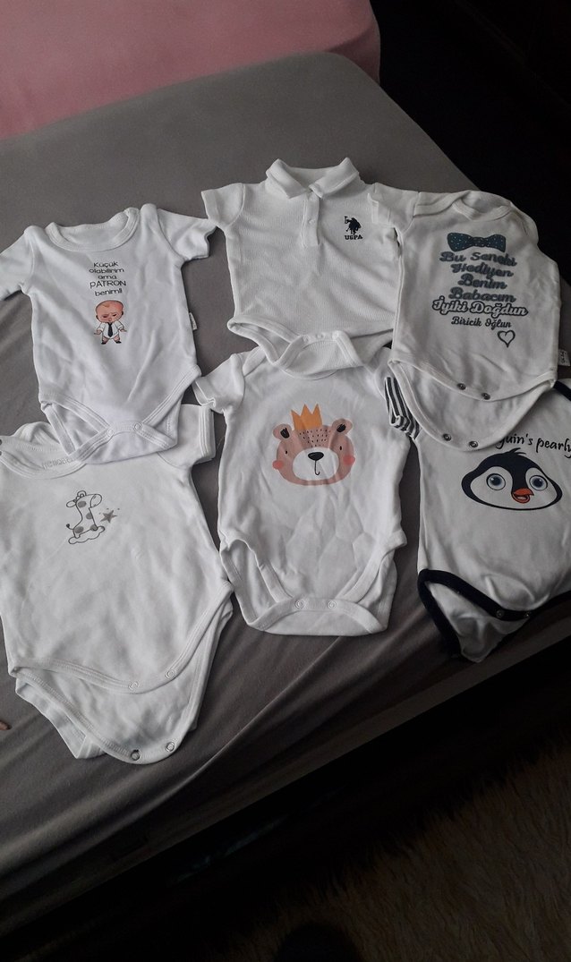 Pamuklu beyaz kısa kollu bebek bodyleri, çeşitli baskılı desenlerle, bisiklet yaka ve rahat normcore tarzında.zıbınlı 11 tanedir