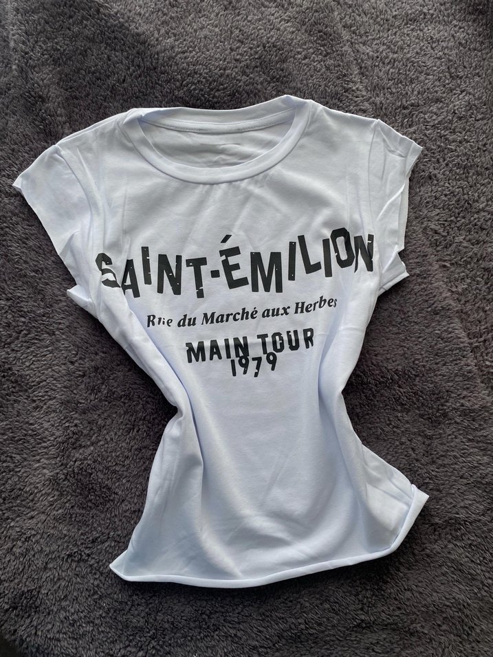 Pamuklu, kısa kollu ve bisiklet yaka olan bu beyaz tişört, Saint-Émilion baskısı ve 1979 tarihli yazılar içerir. Günlük rahat kullanıma uygundur.