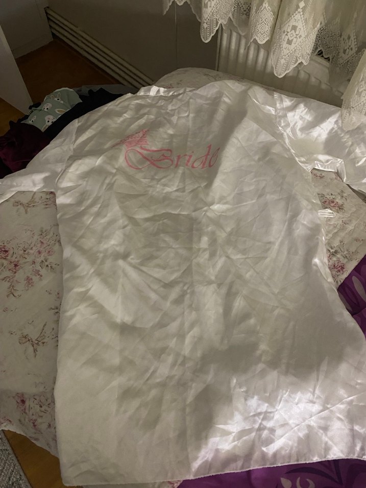 Baskılı, parlak kumaşlı, beyaz, kısa kollu, midi uzunlukta, bol kesim kadın sabahlığı. Vintage bohem tarzını yansıtır.