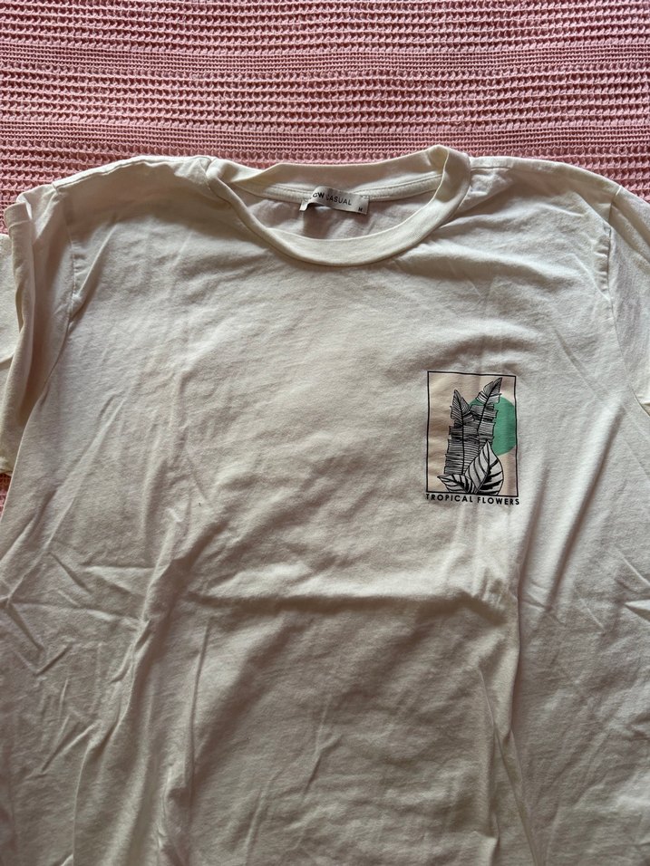 Pamuk kumaştan, uzun kollu ve baskılı tropikal çiçek desenli, salaş kesim beyaz hamile tişörtü. Rahat ve günlük kullanıma uygun.