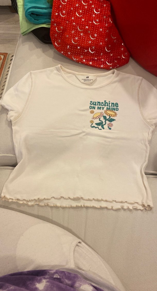 Pamuklu, beyaz, kısa kollu, bisiklet yaka, fitted kesimli kız tişörtü. Pastel renkli baskı ve 'sunshine ON MY MIND' yazısı bulunur.