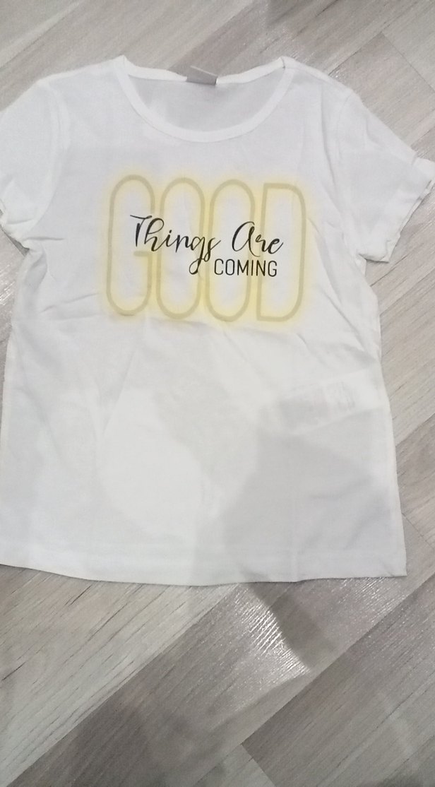 Pamuk kumaştan yapılmış, kısa kollu, bisiklet yaka beyaz kız çocuk tişörtü. Üzerinde "GOOD Things Are COMING" yazılı baskı bulunur. Trend sokak stili için uygun.