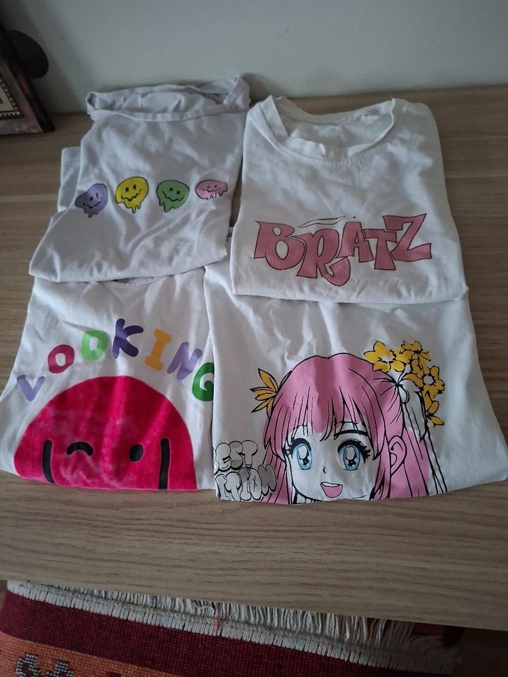 Pamuklu beyaz kız tişörtü, bol kesim ve kısa kollu, yuvarlak yaka. "BRATZ" yazısı ve renkli baskılar içerir, rahat ve trend tarz için uygundur. 2 uzun,2 kısa kollu.