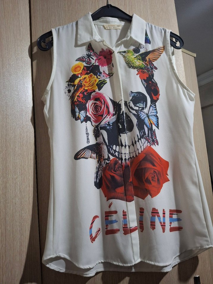 Rahat kesimli, kolsuz beyaz midi gömlek, renkli kafatası ve çiçek baskısıyla. Pürüzsüz sentetik kumaştan üretilmiştir, gündelik sokak giyimi için uygundur. birkaç defa kullanıldı