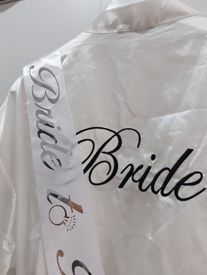 Baskılı, parlak beyaz kumaştan, kısa kollu, bol kesim midi sabahlık. Minimalist tarzda, üzerinde 'Bride' yazısı bulunur.