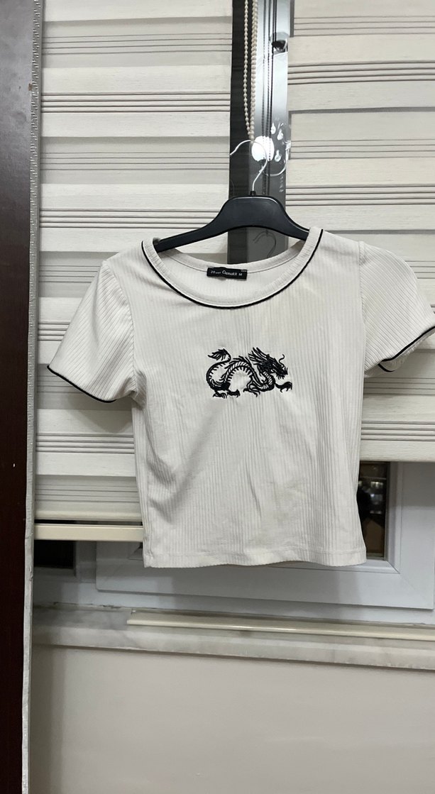 Baskılı ejderha deseni ve kontrastlı yuvarlak yaka detaylı beyaz, kısa kollu, mini kesim kadın tişörtü. Rahat ve şık sokak stili için ideal.