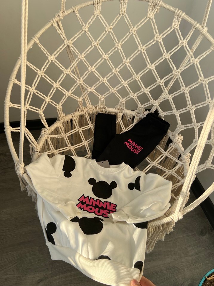 Beyaz renkli, örme kumaştan yapılmış, baskılı Minnie Mouse desenli, askılı kollu bebek kız takımıdır.